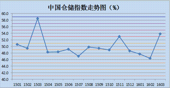 中國物流與采購聯(lián)合會(huì )與中儲發(fā)展股份有限公司聯(lián)合調查的2016年3月中國倉儲指數為53.8%,較上月大幅回升7.4個(gè)百分點(diǎn)。各分項指數中,收費價(jià)格指數、期末庫存指數及業(yè)務(wù)活動(dòng)預期指數出現回落,其余指數均有不同程度的回升。