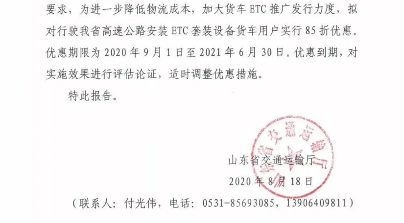 山東省表示:為進(jìn)一步降低物流成本,加大貨車(chē)ETC推廣發(fā)行力度,擬對行駛在山東省高速安裝ETC套裝設備貨車(chē)用戶(hù)實(shí)行85折優(yōu)惠,期限為2020年9月1日至2021年6月30日。